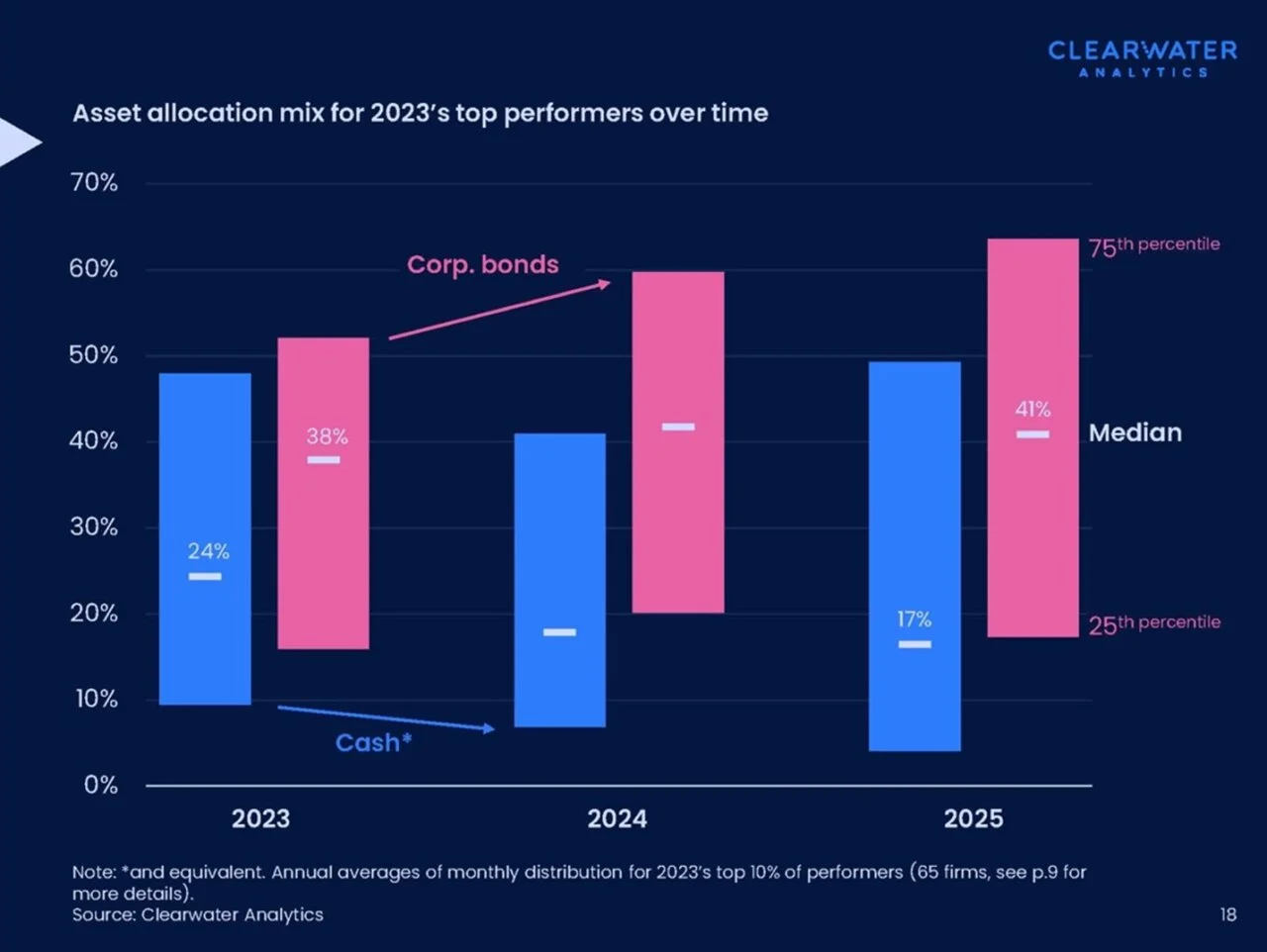 Figure 3: Asset allocation mix of the top corporate performers of 2023. Note: *and equivalent. Annual averages of monthly distribution for 2023’s top 10% of performers (65 firms, see p.9 for more details). Source: Clearwater Analytics.