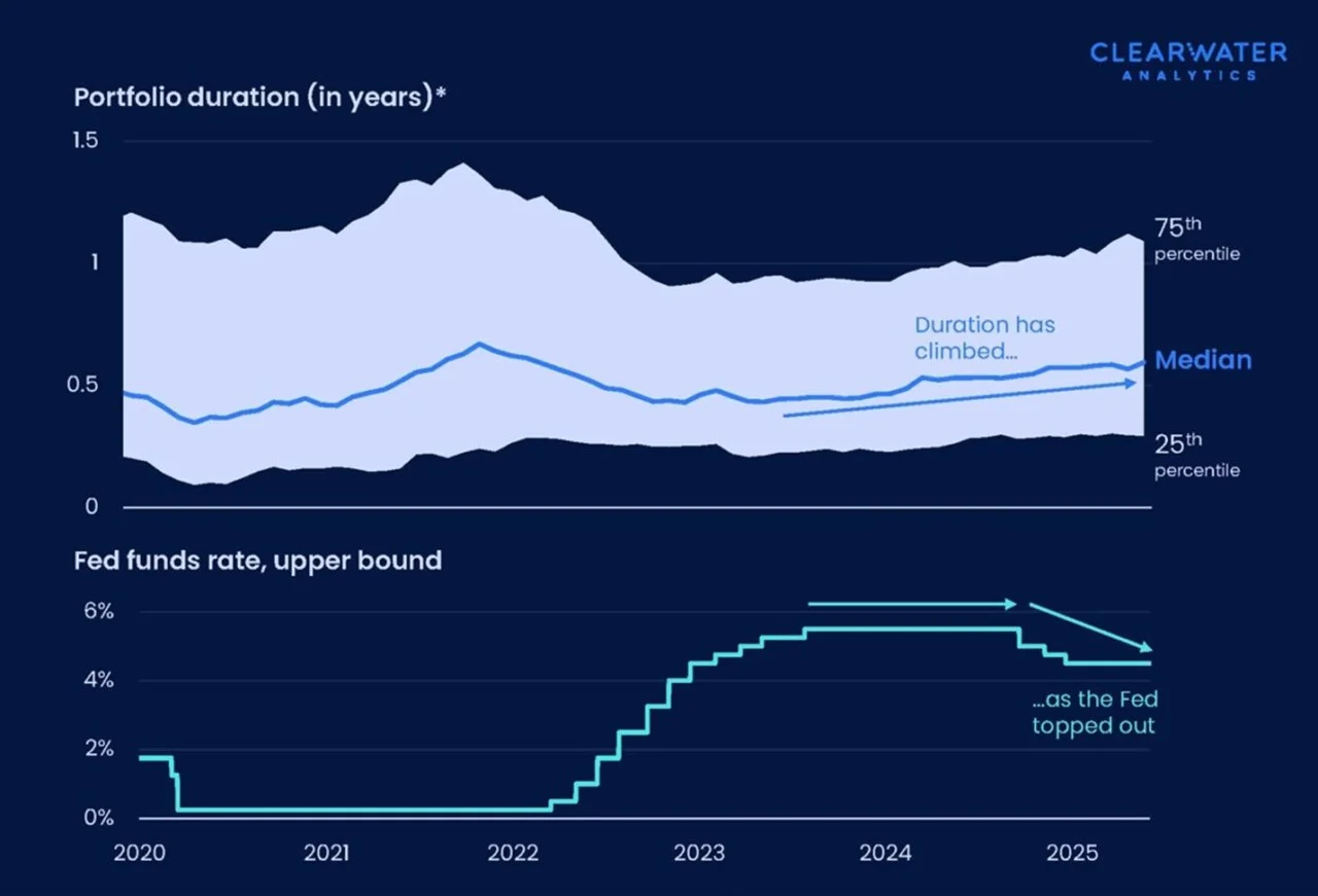 While first-movers have outperformed, today across Clearwater’s database, median portfolio durations are now the highest they have been in several years, roughly doubling from a low in 2023. As the Fed raised rates and then held steady until September 2024, firms went farther out on the curve, locking in longer-term yields.