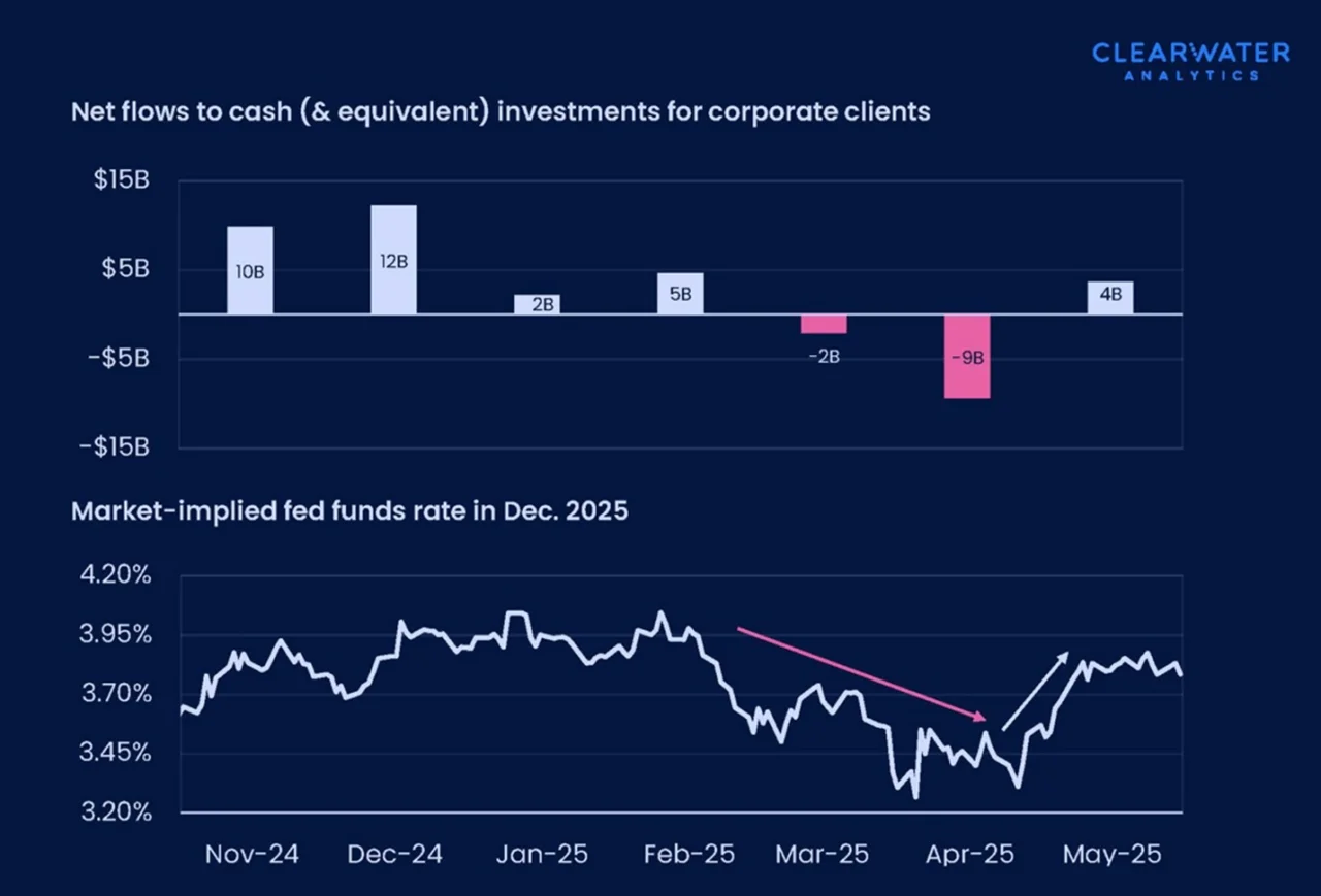 As short rates started to fall in late 2024, many corporates shifted further from cash into bonds, expecting additional cuts. But the Fed has held rates higher than expected, as the economy has proven resilient. As a result, some firms have flip-flopped with their cash strategies (see net flows below). With some weakness in recent macro data, however, firms might very well reverse course again.