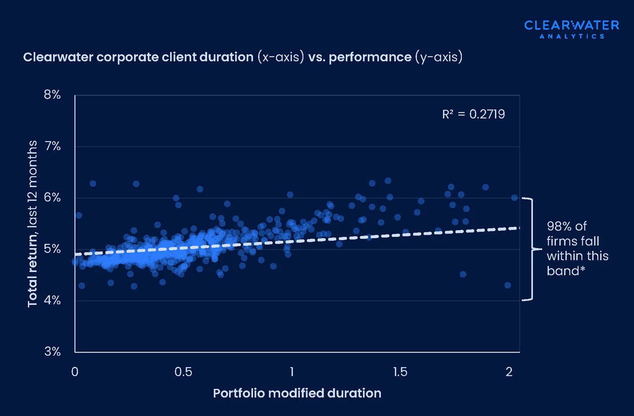 Figure 1: Corporate client portfolio duration versus performance. Note: *Data through 5/2025 for Clearwater corporate clients with >$50M in assets, <= 90% allocated to cash (and equivalents), <=10% allocated to equities, with extreme outliers removed. Duration values are the average value for the last 12 months. Duration values near or at 0 suggest clients are invested in assets outside of fixed income Source: Clearwater Analytics