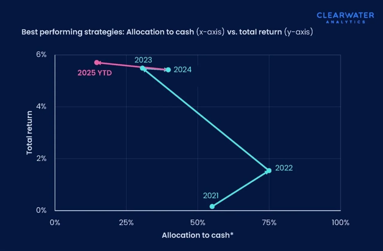 A concrete example: as corporates are limited in their portfolio flexibility (many are unable to invest in equities or corporate bonds, for instance), cash allocations can have a pronounced effect on performance. Thus far in 2025, top performers have held a cash allocation near 15%. Just three years ago, top performance required a 75% cash allocation, per the chart below.