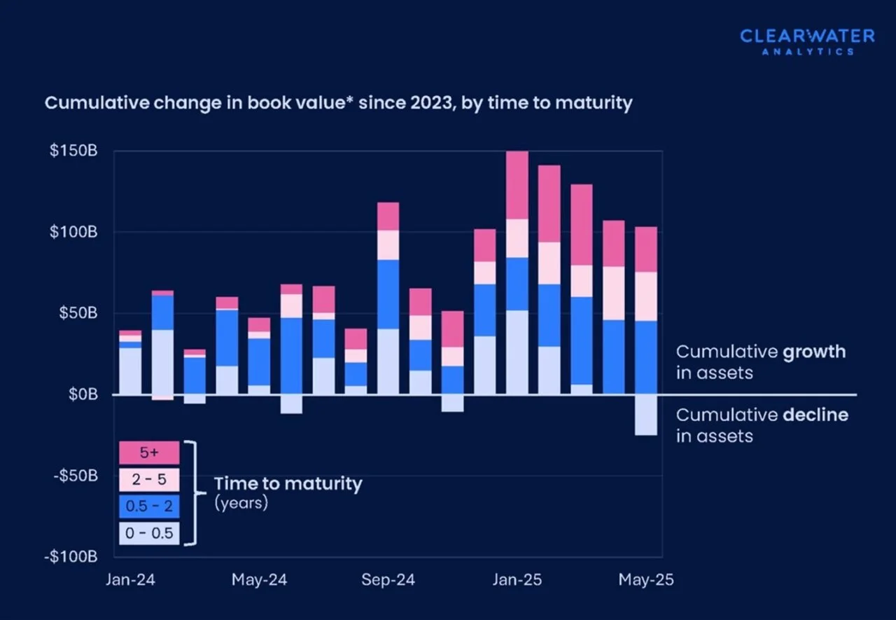 Figure 2: Cumulative change in book value of corporate investments since 2023, by time to maturity. Note: For those Clearwater corporate clients present on 12/31/2023, with >$50M in assets and <= 90% allocated to cash. Source: Clearwater Analytics