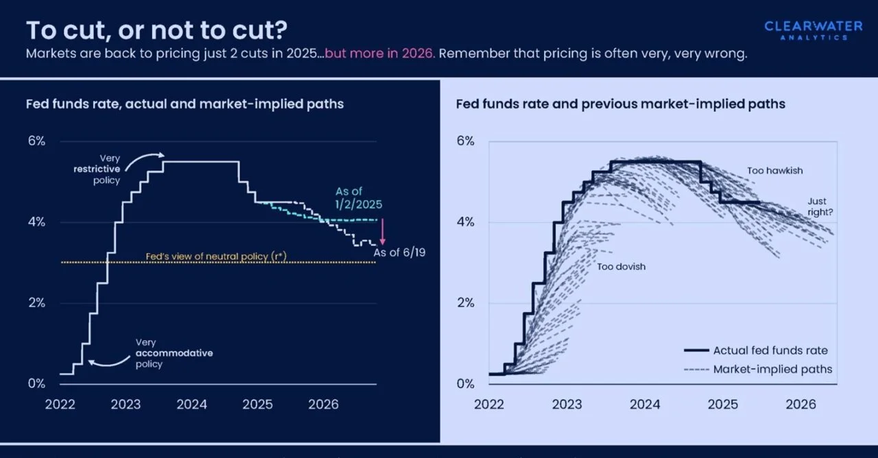 Is duration here to stay? For the time being, almost certainly, though we should be careful not to over-index outcomes for cash on what the market is pricing in months ahead. If we look at the market’s expectation for the fed funds rate over time, most of the implied rate changes were overly dovish during the Fed’s hiking cycle, especially in late 2023 through the first half of 2024. That shifted towards hawkishness, though the Fed subsequently eased. Recent pricing has whipsawed yet again after July’s jobs report.