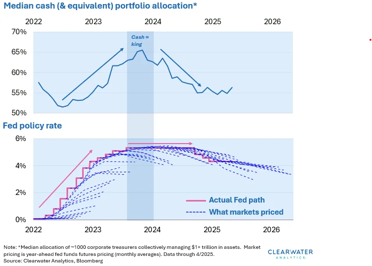 Over the past few years, as rates increased, cash has been a winning strategy for corporate investors in Clearwater’s database. Yet many firms have missed out on better performance. As the chart below shows, corporates appear to have over-indexed on a dovish Fed since 2024. They decreased allocation shares to cash and equivalents—the Fed influences short-term investments most directly—but the Fed has been much slower on the way down than it was on the way up.