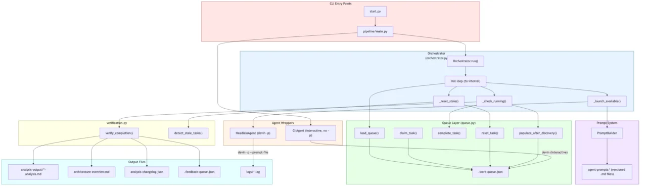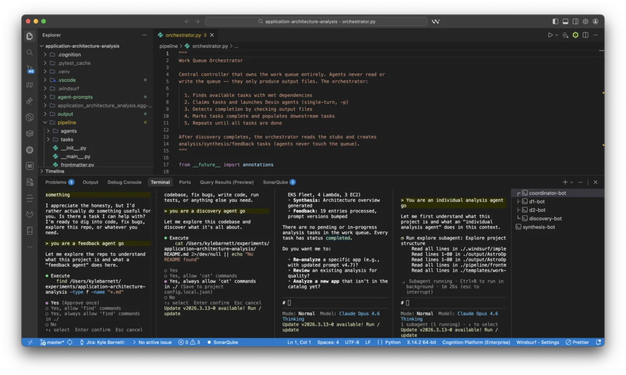 The current version of this project has been reduced to running as a singular python script. The script kicks off a Startup Agent that assists the user in cloning all the repositories for the microservices. Upon exiting the Devin CLI agent, an orchestrator class manages headless versions of the rest of the agent types while maintaining the file-based task queue and kicking off the associated agent for each task (discovery, analysis, synthesis, and feedback). Each agent was launched with a combined prompt + task created by the orchestrator depending on what is available in the queue.