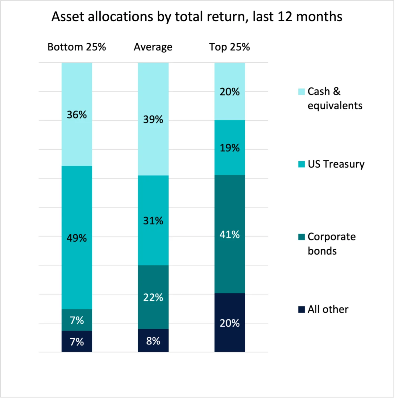 The lowest performing group has almost half of their portfolio in Treasuries, followed by cash, and then equally small amounts of corporate bonds and other investments.