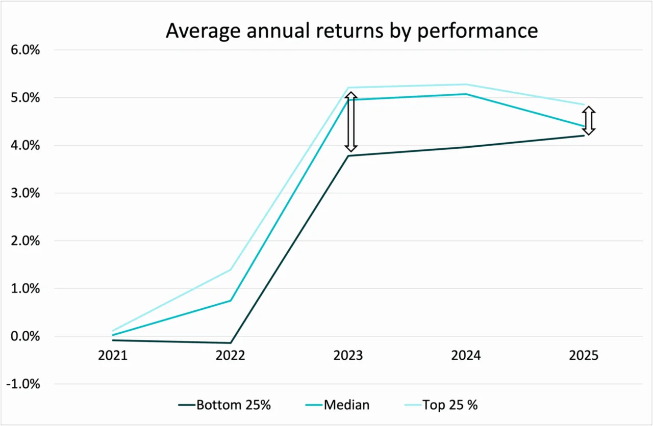 In 2021 all three groups had near zero yields. As rates rose, the fastest movers deployed cash into Treasuries and significantly outperformed many of their peers, hitting twice the median return in 2022. The following year saw a big leap in yields; followed by a compressing of returns in 2024 as rates held steady; then, a narrowing between the top and bottom groups as returns converged to the median.