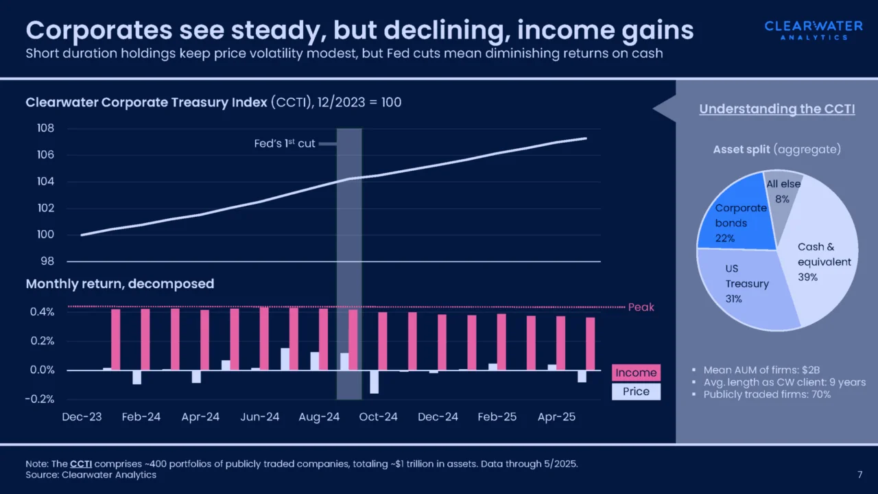 The 7% figure, along with portfolio allocation data below, is drawn from the Clearwater Corporate Treasury Index (CCTI), developed by Clearwater to gauge the performance and strategy of our client base. The CCTI tracks approximately 400 portfolios of publicly traded companies, totaling ~$1 trillion in assets, and provides a valuable baseline for analyzing investment strategies within Clearwater’s corporate client base. According to CCTI data, average allocations are distributed across cash and equivalents (39%), U.S. treasuries (31%), corporate bonds (22%), and a small remaining portion (8%) comprising other government bonds, structured products, and stocks.