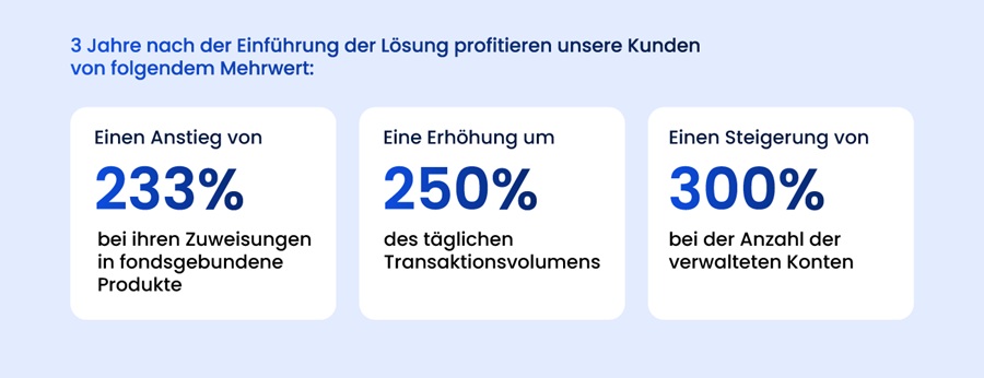 Seit der Einführung unserer Lösung konnten unsere Kunden eine Vielzahl von Aufgaben im Zusammenhang mit der Verwaltung von fondsgebundenen Lebensversicherungen automatisieren. Bei gleicher Anzahl von Mitarbeitern verzeichnen sie einen Anstieg von 233 % bei ihren Zuweisungen in die fondsgebundenen Lebensversicherungen. Sie beobachten auch einen Anstieg des täglichen Transaktionsvolumens um über 250 % sowie einen Anstieg der Anzahl der verwalteten Konten um fast 300 %.